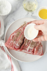 - Rub the tri-tip roast on all sides with the salt, pepper, and garlic powder. Let it sit at room temperature for 15 minutes so the flavors can settle.