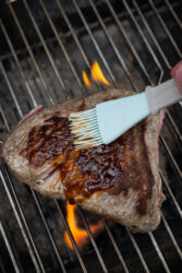 - Place the tri-tip on the cooler, indirect heat side of the grill. Grill for about 20 minutes, turning every 5-7 minutes. Baste with the warmed sauce after each flip to keep the meat moist.