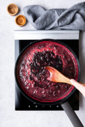 Blackberry jam tastes like summer in a spoonful. In fact, sometimes I’ll make this jam in the summer and preserve it for the winter so I can pretend it’s July on one of the many subzero days Wisconsin graces us with. It’s bright, deep, and fruity, with a slight tang from the lemon. This spreadable jam stays glossy, thick and without that gummy texture some store-bought jams have.