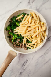 Most of the flavor comes from the Italian sausage, so this is not the place to cut corners. In my humble-ish opinion, simple recipes require quality ingredients. Buy a pound from your local butcher who actually knows how to season sausage—you’ll taste the difference. As for pasta, I stick with bronze-cut penne. Never heard of it? Basically, bronze-cut pasta is shaped from molds that create coarse ridges, allowing even lighter sauces to cling well to the pasta. That’s exactly what you want for a recipe like this.