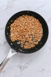 - Add the remaining garlic to the skillet. Stir constantly and fry until the garlic turns a pale golden color, about 3 to 5 minutes. Do not let it brown too much to avoid bitterness.