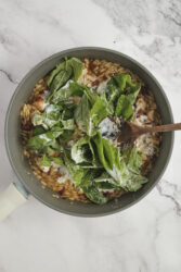 - Once the orzo is tender, stir in the heavy cream, baby spinach, and Parmesan cheese. Cook until the spinach wilts and the cheese melts, then taste and adjust seasonings.