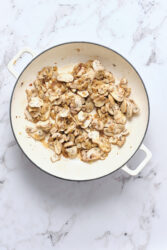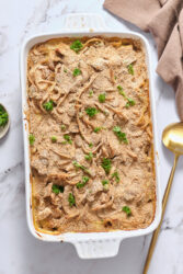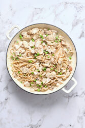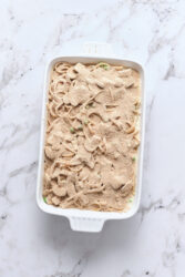 Make sure your leftover Tetrazzini has cooled completely before transferring it to an airtight container. Refrigerate it for 2-3 days, or move it to a freezer-safe container and freeze for up to 3 months. Then thaw it in the fridge overnight before reheating. For the sake of ease and simplicity, I recommend portioning it out and microwaving each portion on high for 60-90 seconds. However, if you have a lot of leftovers, consider using the same casserole pan with a splash of water and heat it all up in the oven at 350°F for 15-20 minutes, until it’s warm.
