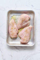 - Arrange the chicken breasts in the dish. Drizzle them with olive oil, then season both sides with garlic powder, onion powder, salt, and pepper.