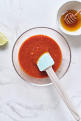 - In a small bowl, whisk hot pepper sauce, melted butter, honey, lime juice, and minced garlic until combined. Adjust sweetness with additional honey, if needed.