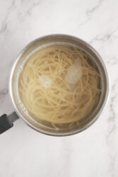 - Preheat the oven to 350°F. Bring a large pot of salted water to a boil, add the spaghetti and cook until al dente. Drain and set aside.