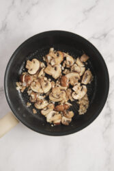 - In a large skillet, melt the butter over medium heat. Add the mushrooms, onion, and garlic. Sauté until the onions are soft and the mushrooms are lightly browned, about 5 to 7 minutes.