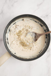 - Sprinkle the flour over the vegetables and stir for about 1 minute. Gradually whisk in the chicken broth and milk, stirring constantly to avoid lumps. Bring the sauce to a simmer and let it thicken for 3 to 4 minutes. Stir in the sour cream, dried thyme, oregano, salt, and pepper.