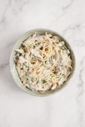 - In a large bowl, combine the cooked spaghetti, chicken, the sautéed vegetable sauce, and frozen peas. Mix until well combined.