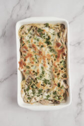 - Transfer the mixture into a lightly greased 9x13-inch casserole dish. Evenly sprinkle the mozzarella and Parmesan cheeses on top. Bake in the preheated oven for 25 to 30 minutes, until the cheese is melted and bubbly. Garnish with chopped fresh parsley and serve warm.
